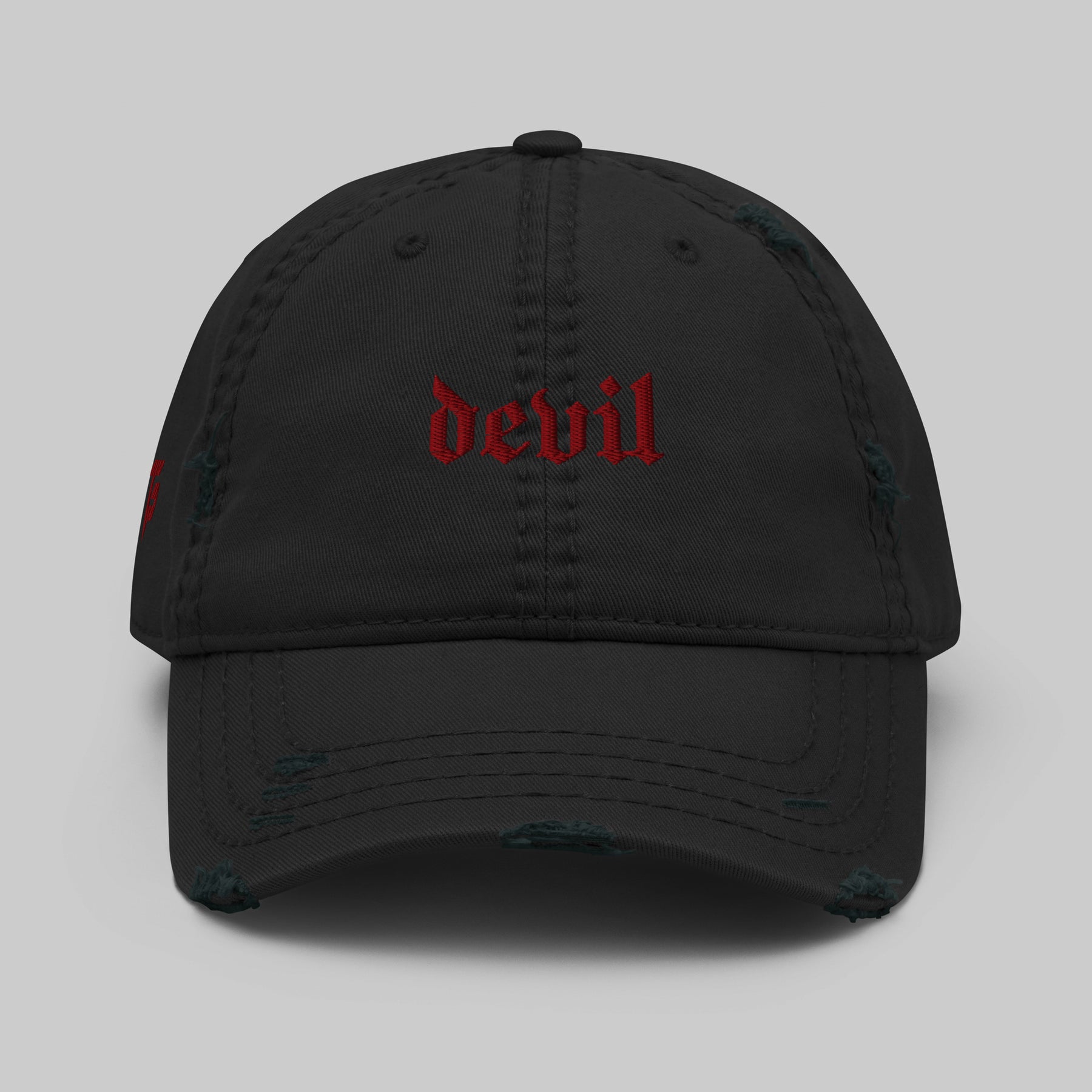 Bold style meets rebellion in the devil distressed cap. Its worn black canvas and striking red embroidery spark a fiery presence at any event. Crafted from 100% chino cotton twill, the cap offers an unstructured design with adjustable hook-and-loop closure and side logo embroidery for unmistakable detail and individuality.